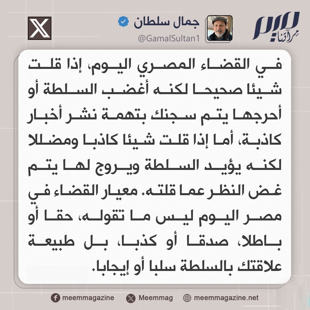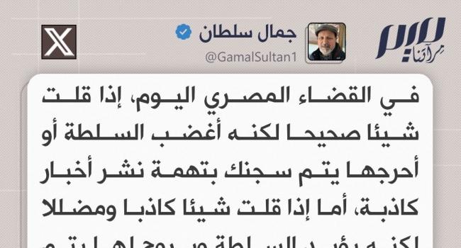 جمال سلطان: في القضاء المصري اليوم، إذا قلت شيئا صحيحا لكنه أغضب السلطة أو أحرجها يتم سجنك بتهمة نشر أخبار كاذبة، أما إذا قلت شيئا كاذبا ومضللا لكنه يؤيد السلطة ويروج لها يتم غض النظر عما قلته.