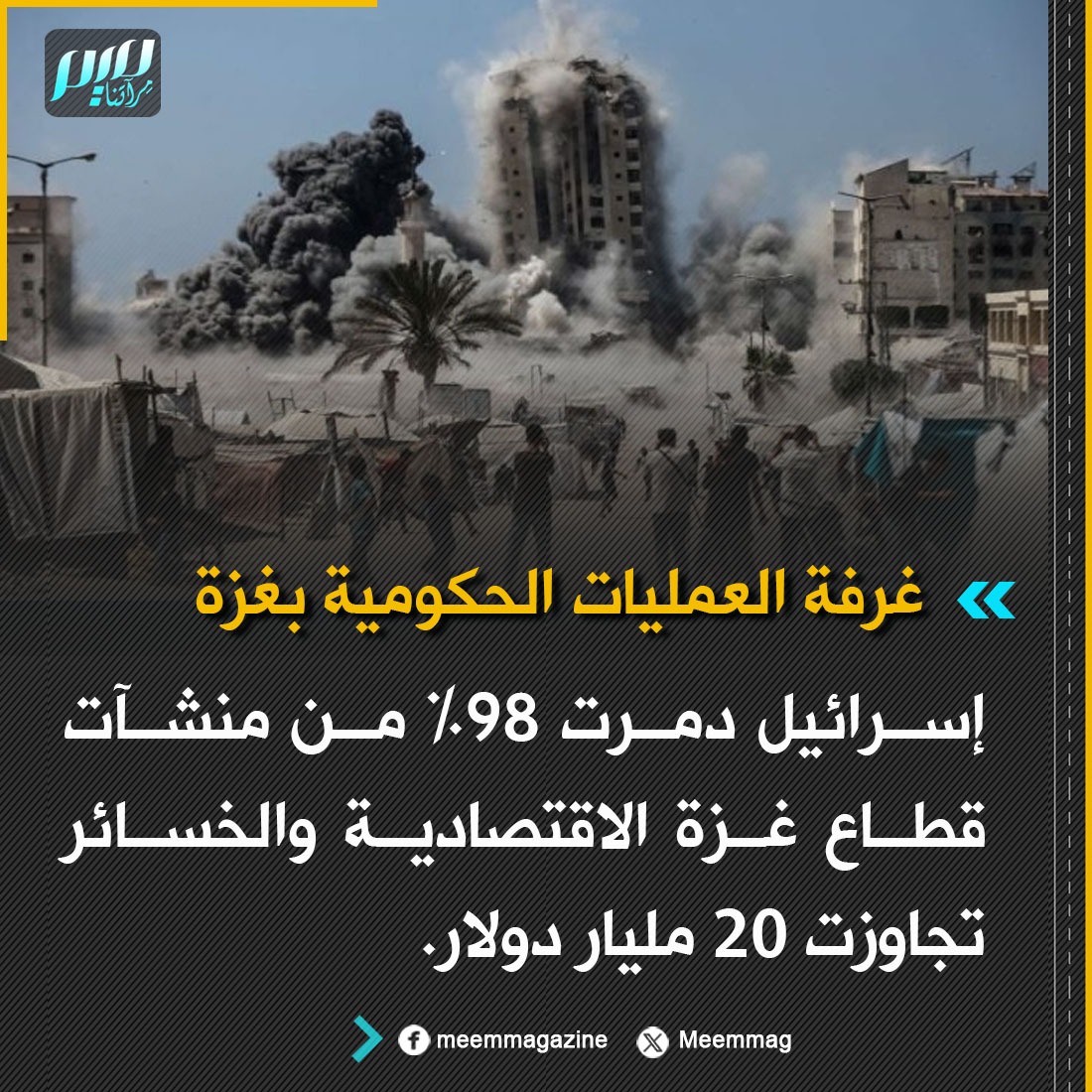 غرفة العمليات الحكومية بغزة: إسرائيل دمرت 98% من منشآت قطاع غزة الاقتصادية والخسائر تجاوزت 20 مليار دولار.