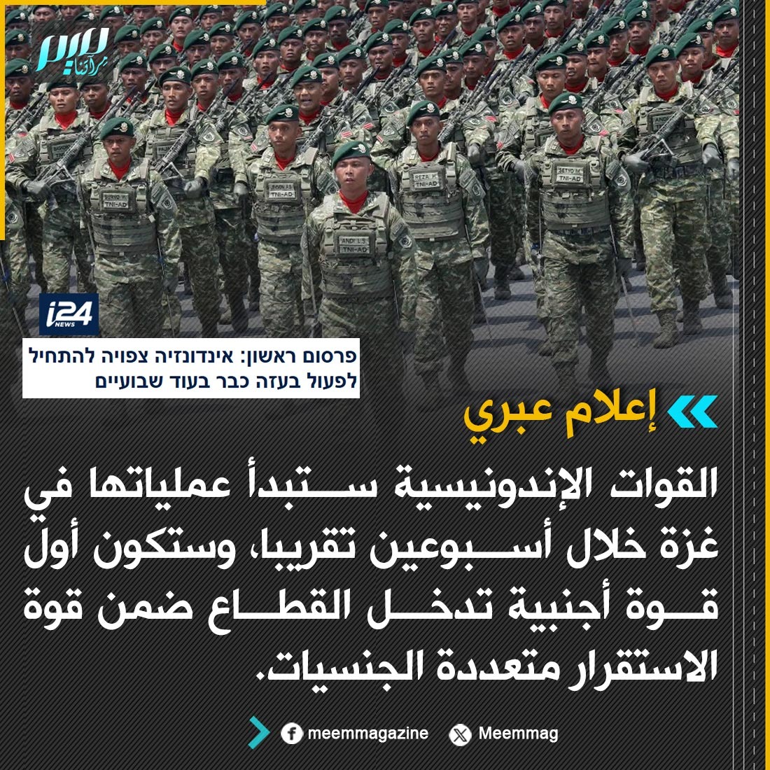 إعلام عبري: القوات الإندونيسية ستبدأ عملياتها في غزة خلال أسبوعين تقريبا