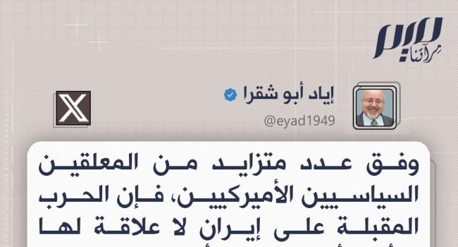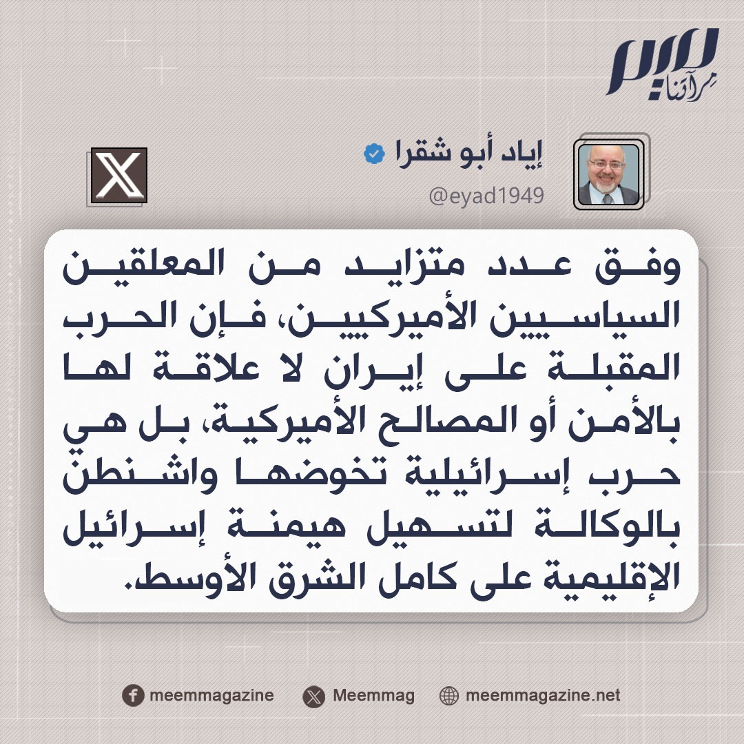 إياد أبو شقرا: الحرب المقبلة على إيران لا علاقة لها بالأمن أو المصالح الأميركية، بل هي حرب إسرائيلية تخوضها واشنطن بالوكالة لتسهيل هيمنة إسرائيل الإقليمية على كامل الشرق الأوسط.