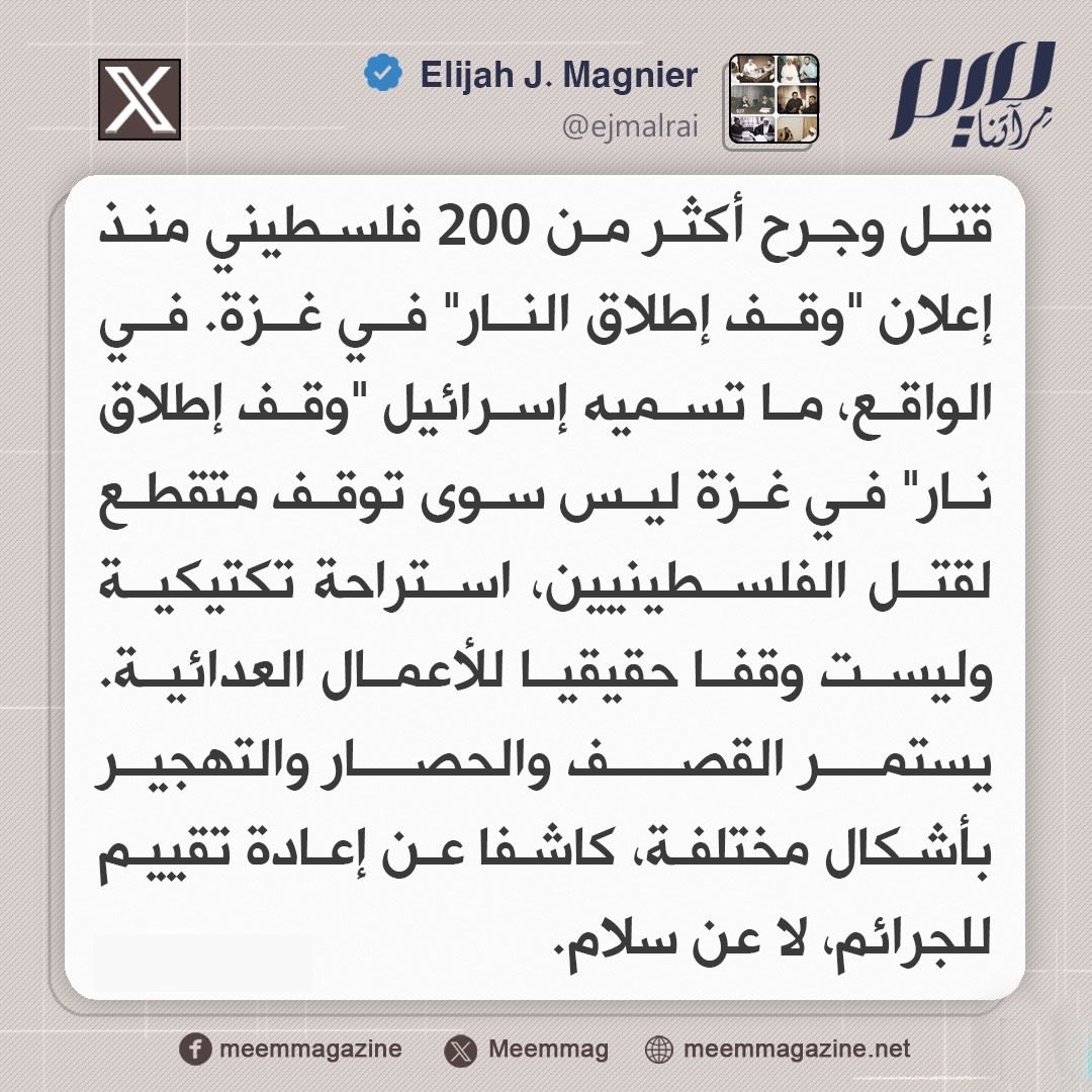 المحلل العسكري إيليا ماغنييه: ما تسميه إسرائيل "وقف إطلاق نار" في غزة ليس سوى توقف متقطع لقتل الفلسطينيين، استراحة تكتيكية وليست وقفا حقيقيا للأعمال العدائية.
