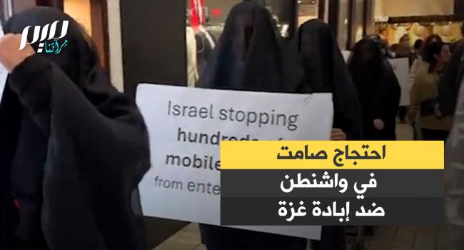 احتجاج صامت داخل مركز تجاري في واشنطن خلال تخفيضات "البلاك فرايداي"، رفع فيه المشاركون لافتات تندد بالإبادة في غزة وتواطؤ بعض الماركات العالمية، داعين إلى مقاطعة إسرائيل.