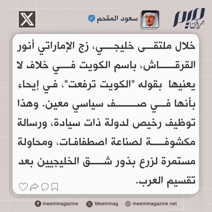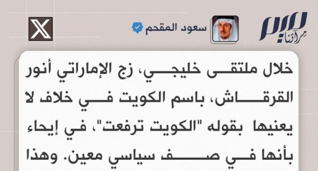 اعتبره توظيفا رخيصا ومحاولة لزرع الفتنة.. الكاتب السعودي سعود المقحم يتهم المستشار الدبلوماسي أنور قرقاش، بالزج باسم الكويت في اصطفاف سياسي موال للإمارات، خلال ملتقى خليجي.