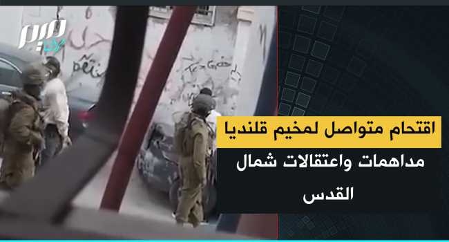 قوات الاحتلال تواصل اقتحام مخيم قلنديا شمال القدس المحتلة، مع تنفيذ حملة مداهمات واعتقالات وسط توتر ميداني متصاعد في المنطقة.
