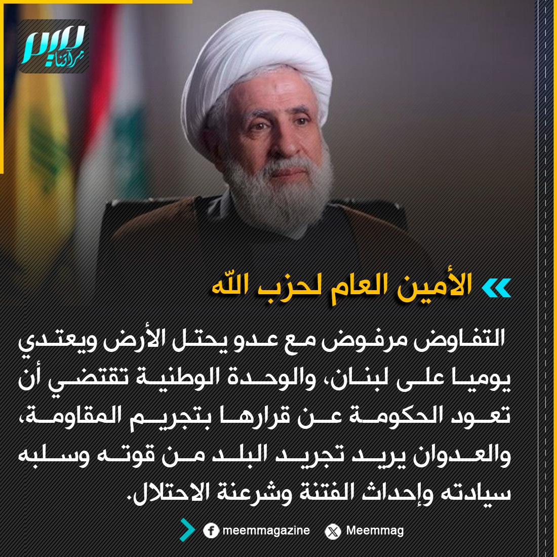 الأمين العام لحزب الله: التفاوض مرفوض مع عدو يحتل الأرض ويعتدي يوميا على لبنان، والوحدة الوطنية تقتضي أن تعود الحكومة عن قرارها بتجريم المقاومة، والعدوان يريد تجريد البلد من قوته وسلبه سيادته وإحداث الفتنة وشرعنة الاحتلال.