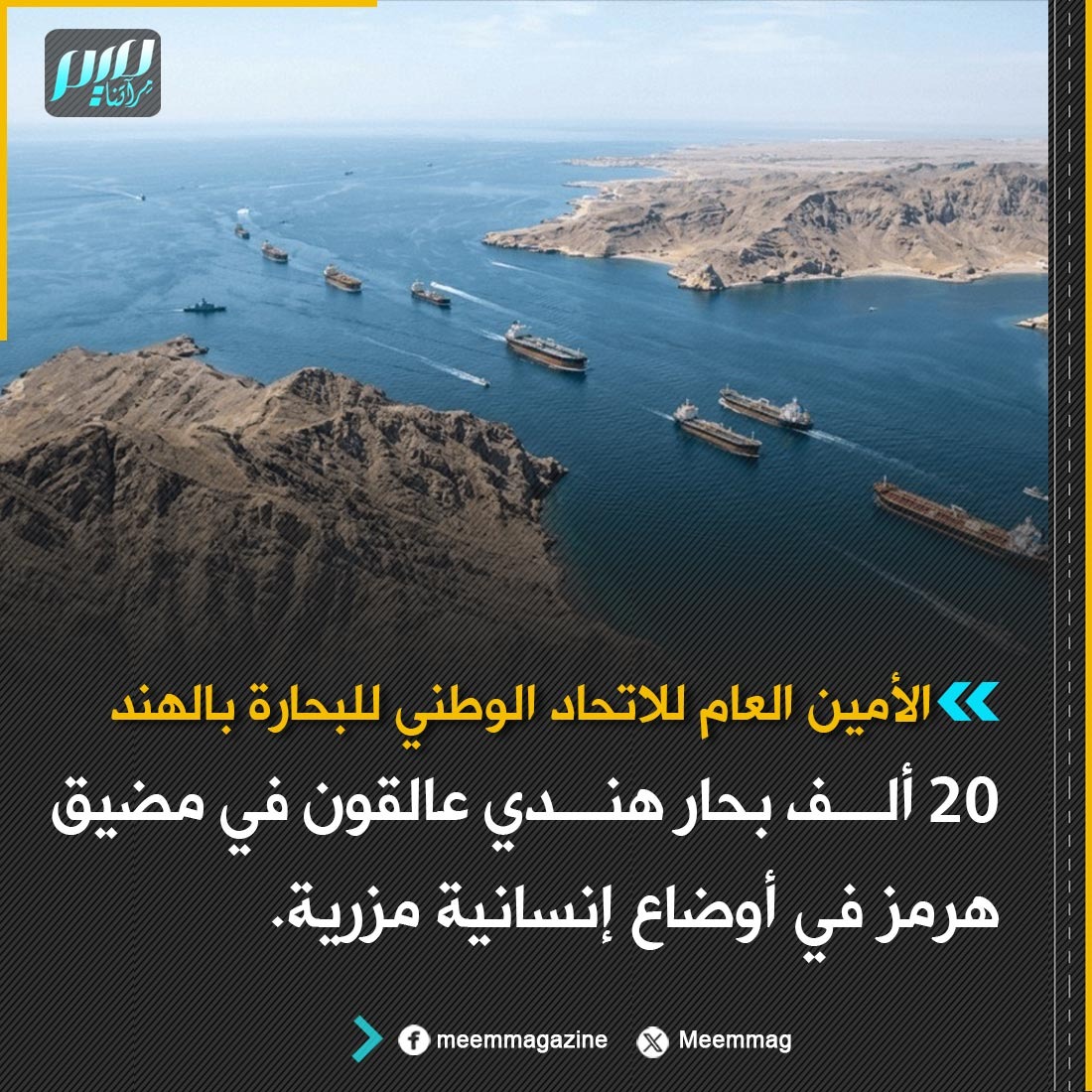 الأمين العام للاتحاد الوطني للبحارة بالهند: 20 ألف بحار هندي عالقون في مضيق هرمز في أوضاع إنسانية مزرية.