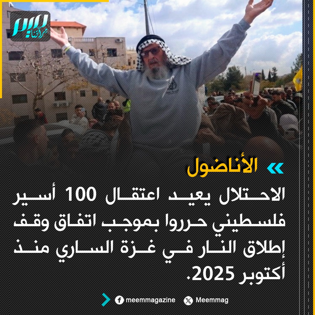 الأناضول: الاحتلال يعيد اعتقال 100 أسير فلسطيني حرروا بموجب اتفاق وقف إطلاق النار في غزة الساري منذ أكتوبر 2025.