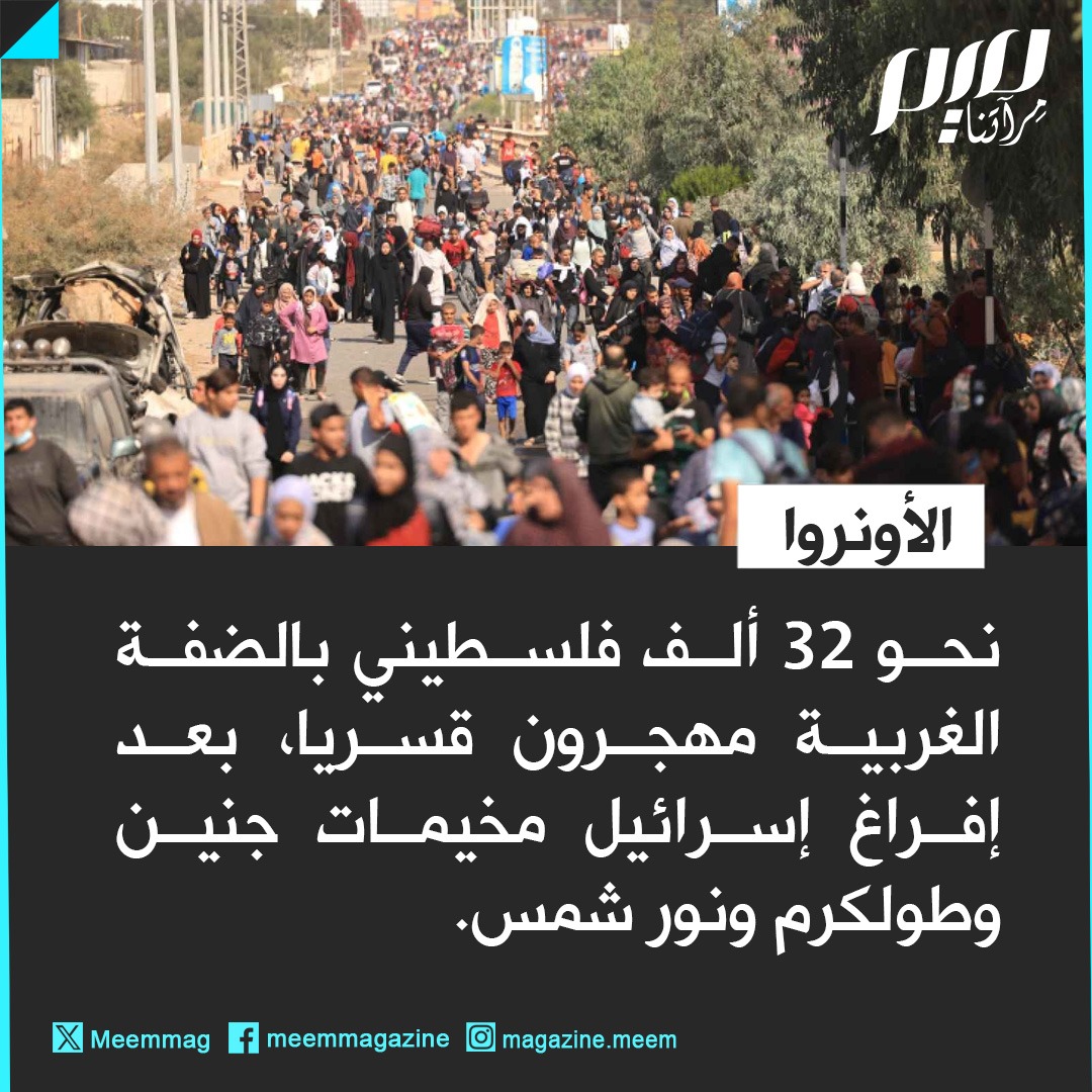 الأونروا: نحو 32 ألف فلسطيني بالضفة الغربية مهجرون قسريا، بعد إفراغ إسرائيل مخيمات جنين وطولكرم ونور شمس.