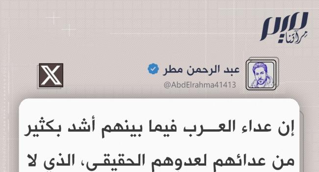 الإعلامي عبد الرحمن مطر: إن عداء العرب فيما بينهم أشد بكثير من عدائهم لعدوِهم الحقيقي، الذي لا يرحمهم، حتى وإن اختلفت معتقداتهم وطوائفهم وجغرافياتهم.