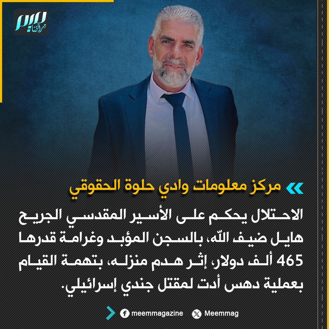 الاحـ.تـ.لال يحكم على الأسير المقدسي الجريح هايل ضيف الله، بالسجن المؤبد وغرامة قدرها 465 ألف دولار، إثر هدم منزله، بتهمة القيام بعملية دهس أدت لمقتل جندي إسرائيلي.
