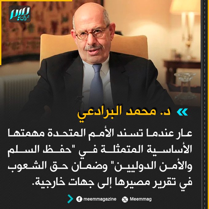 البرادعي: عار عندما تسند الأمم المتحدة مهمتها الأساسية المتمثلة في "حفظ السلم والأمن الدوليين" وضمان حق الشعوب في تقرير مصيرها إلى جهات خارجية.