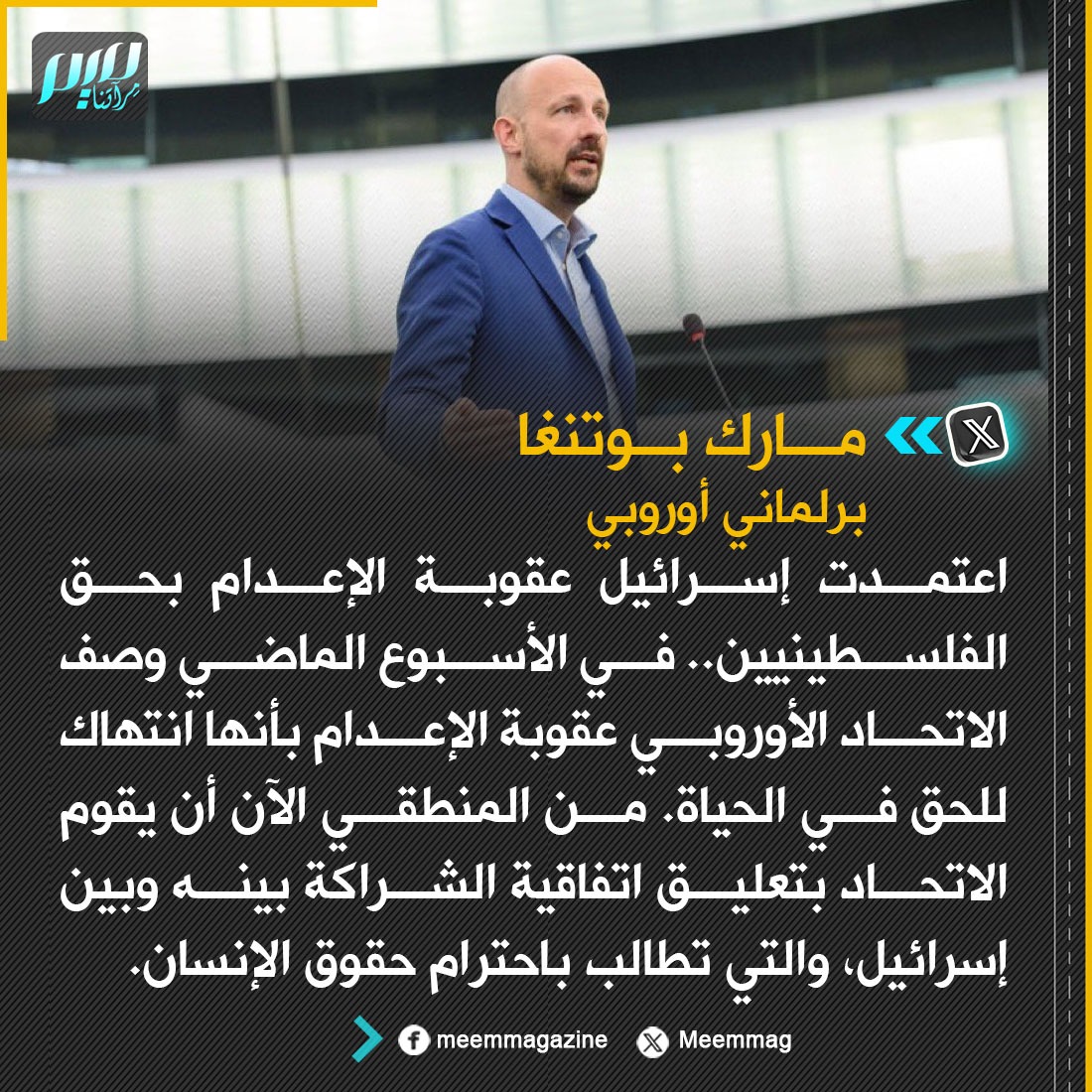 البرلماني الأوروبي مارك بوتنغا: من المنطقي أن يقوم الاتحاد الأوروبي الآن بتعليق اتفاقية الشراكة بينه وبين إسرائيل.