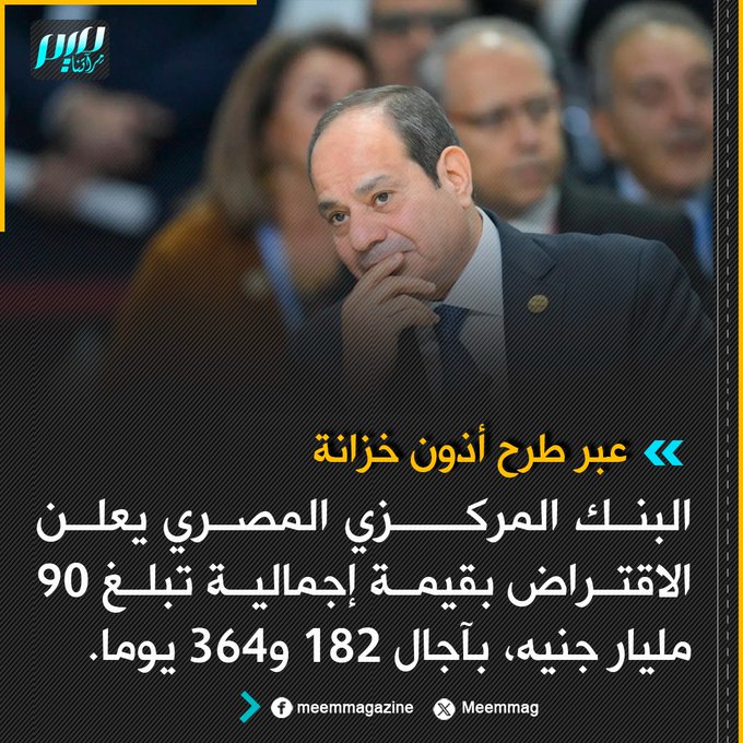 البنك المركزي المصري يعلن الاقتراض عبر طرح أذون خزانة، بقيمة إجمالية تبلغ 90 مليار جنيه