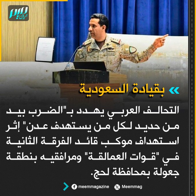 التحالف العربي بقيادة السعودية يهدد بـ"الضرب بيد من حديد لكل من يستهدف عدن" إثر استهداف موكب قائد الفرقة الثانية في "قوات العمالقة" ومرافقيه بنطقة جعولة بمحافظة لحج.