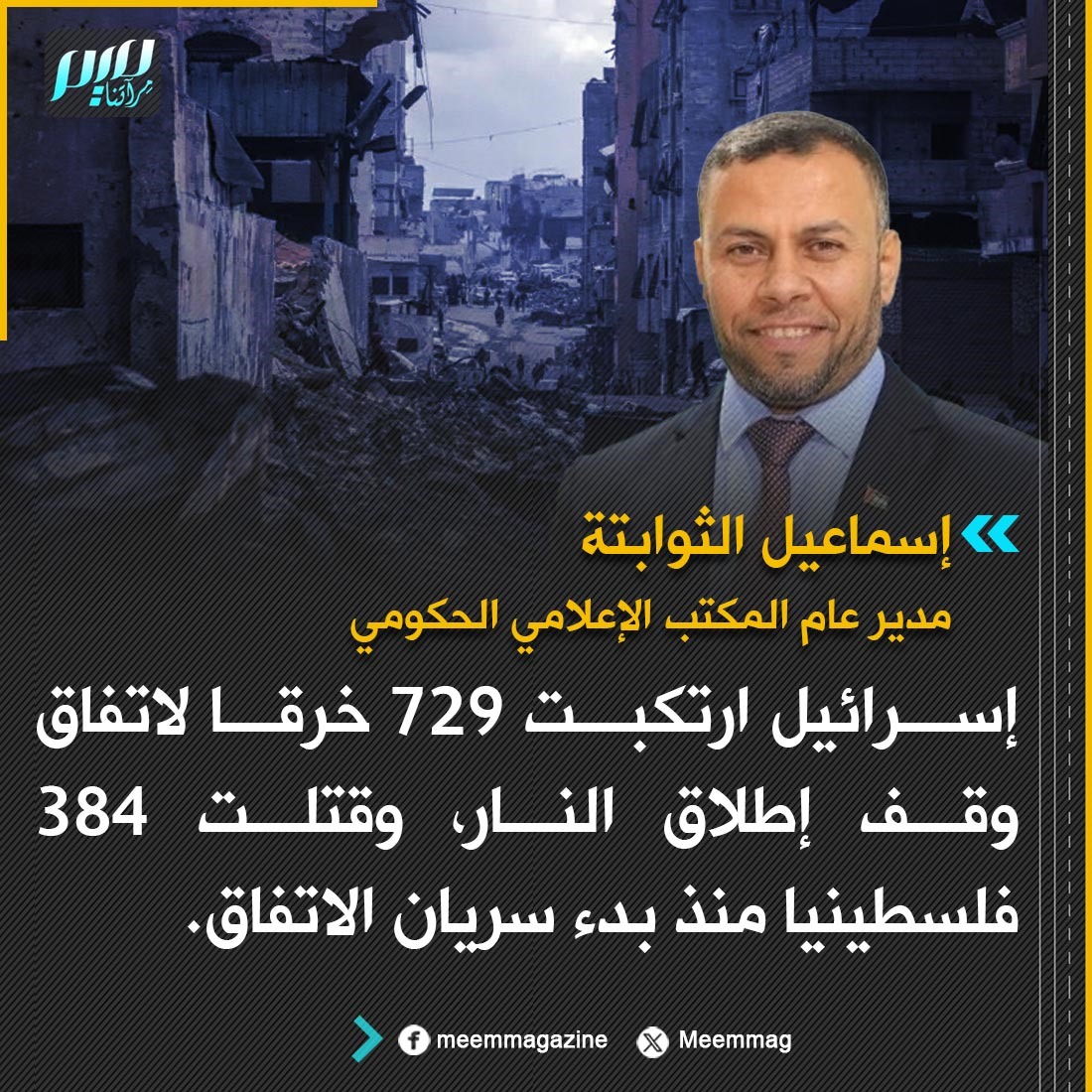 الثوابتة: إسرائيل ارتكبت 729 خرقا لاتفاق وقف إطلاق النار، وقتلت 384 فلسطينيا منذ بدء سريان الاتفاق.