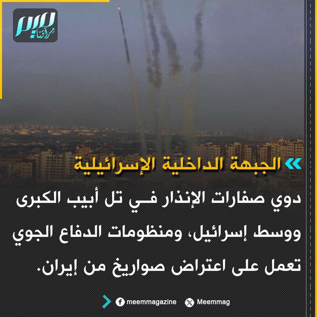 الجبهة الداخلية الإسرائيلية: دوي صفارات الإنذار في تل أبيب الكبرى ووسط إسرائيل، ومنظومات الدفاع الجوي تعمل على اعتراض صواريخ من إيران.