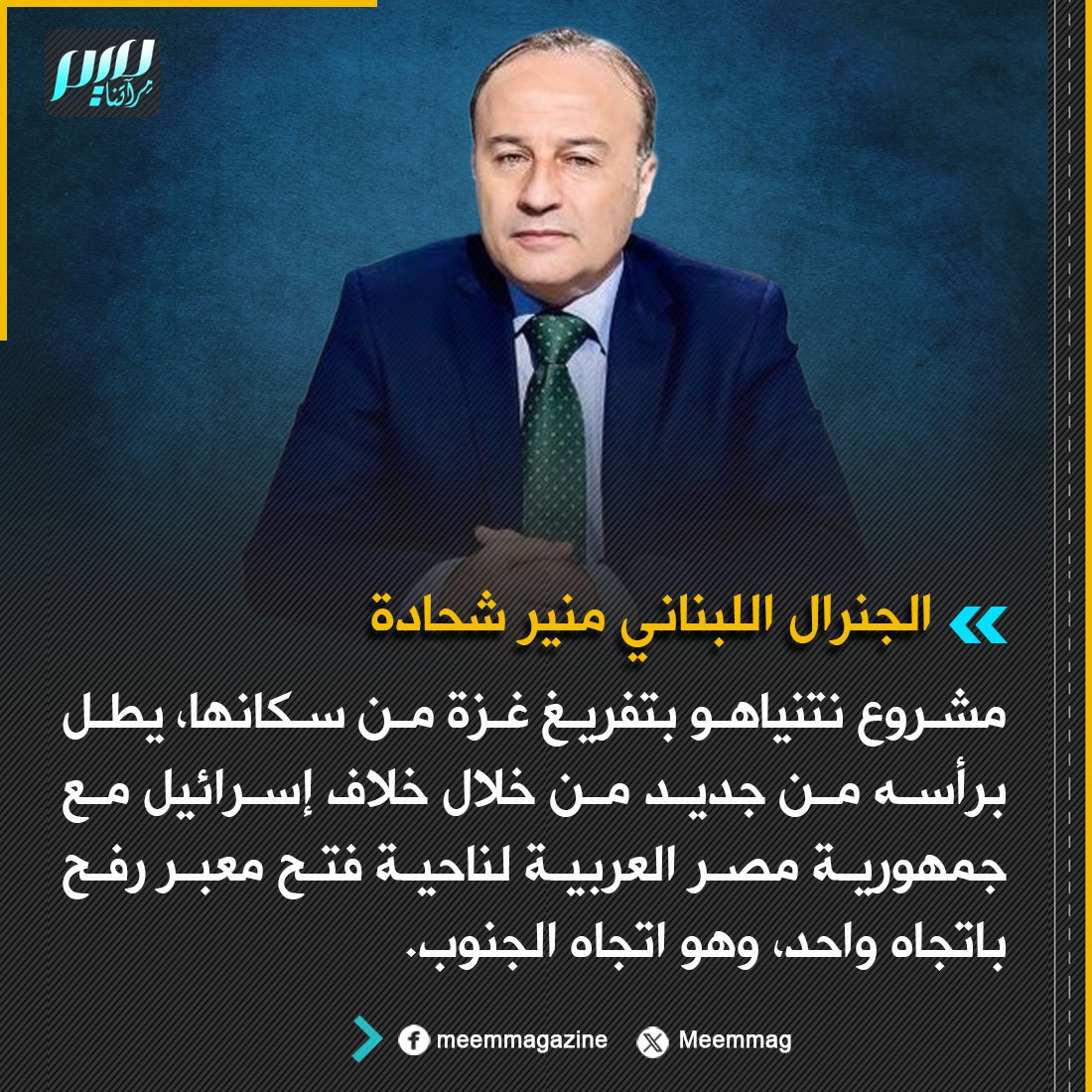الجنرال شحادة: مشروع نتنياهو بتفريغ غزة من سكانها، يطل برأسه من جديد من خلال خلاف إسرائيل مع جمهورية مصر العربية لناحية فتح معبر رفح باتجاه واحد، وهو اتجاه الجنوب.