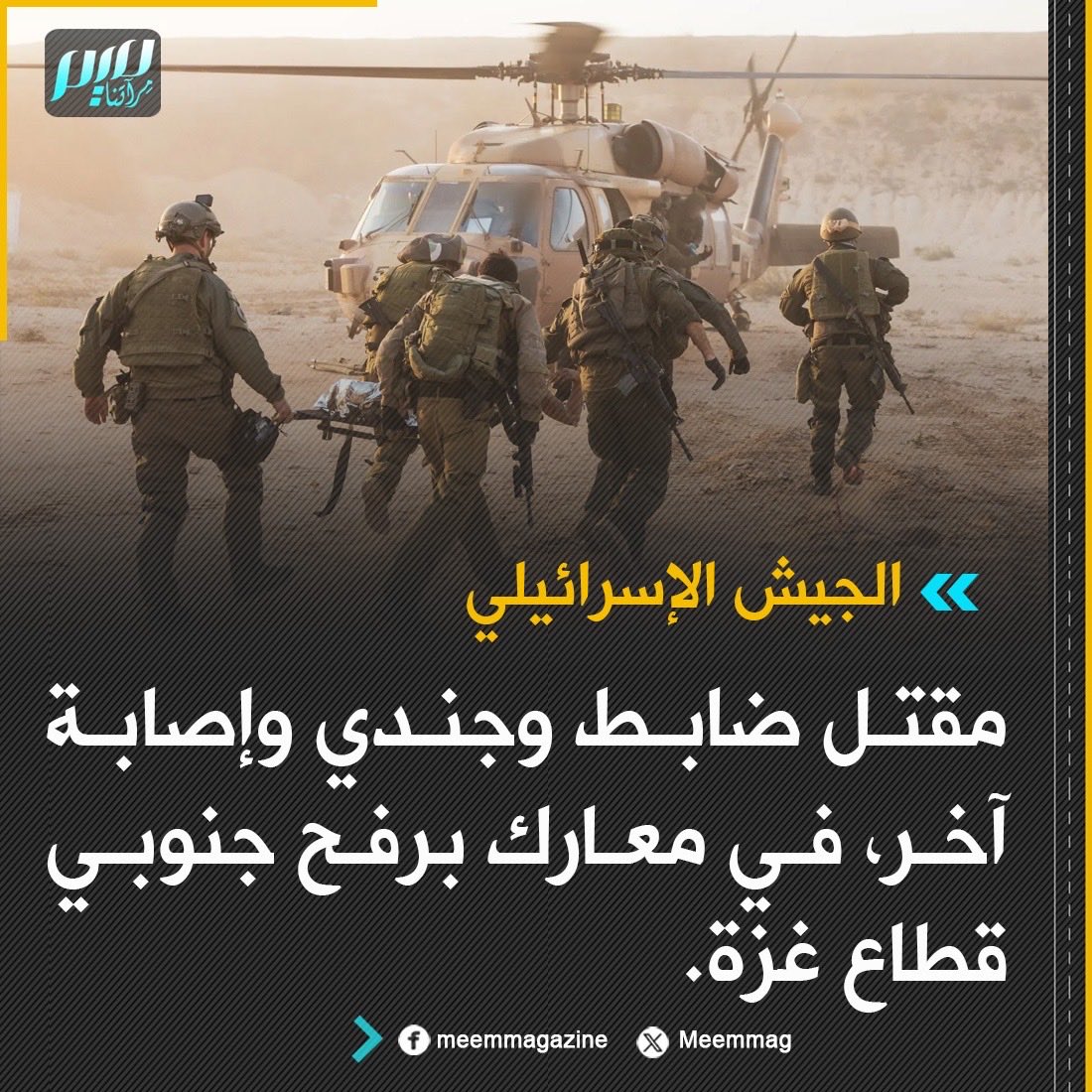 الجيش الإسرائيلي: مقتل ضابط وجندي وإصابة آخر في معارك برفح جنوبي قطاع غزة.