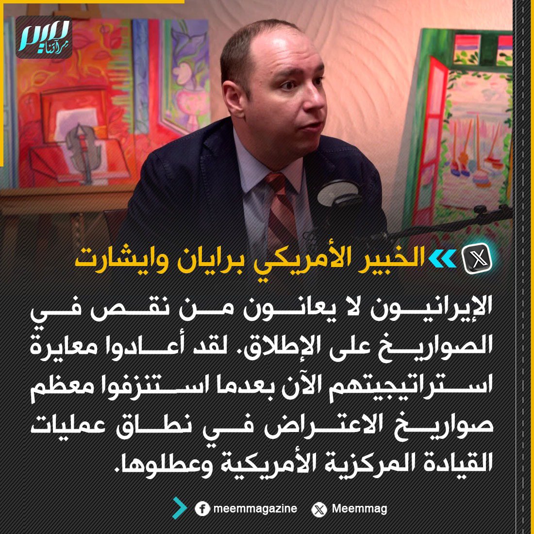 الخبير الأمريكي برايان وايشارت: الإيرانيون لا يعانون من نقص في الصواريخ على الإطلاق. لقد أعادوا معايرة استراتيجيتهم الآن بعدما استنزفوا معظم صواريخ الاعتراض في نطاق عمليات القيادة المركزية الأمريكية وعطلوها.