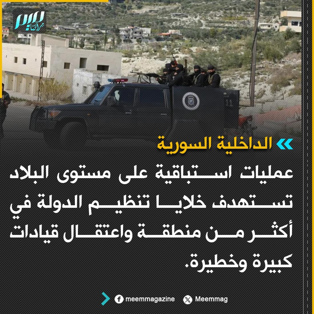 الداخلية السورية: عمليات استباقية على مستوى البلاد تستهدف خلايا تنظيم الدولة في أكثر من منطقة واعتقال قيادات كبيرة وخطيرة.