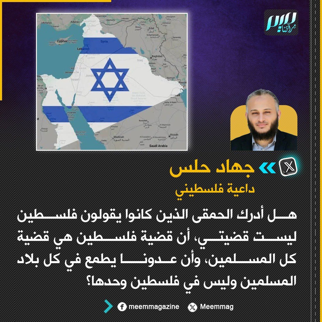 الداعية الفلسطيني جهاد حلس: هل أدرك الحمقى الذين كانوا يقولون "فلسطين ليست قضيتي"، أن فلسطين هي قضية كل المسلمين، وأن عــدونــا يطمع في كل بلاد المسلمين وليس في فلسطين وحدها؟