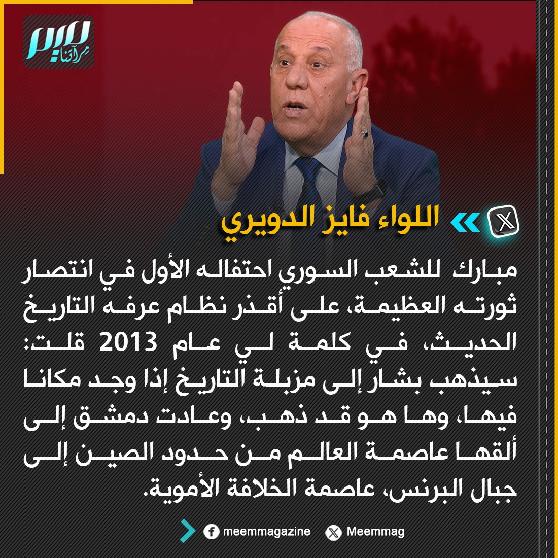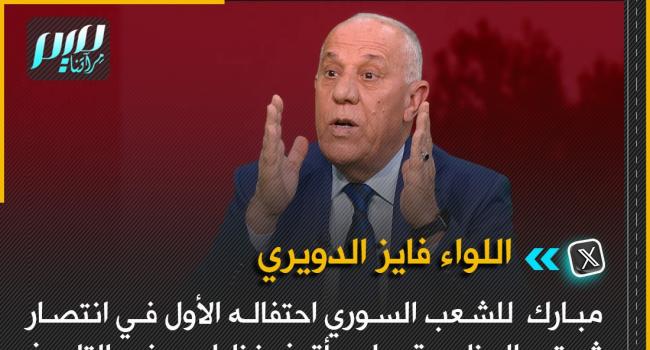 الدويري: مبارك للشعب السوري احتفاله الأول في انتصار ثورته العظيمة، على أقذر نظام عرفه التاريخ الحديث، في كلمة لي عام 2013 قلت: سيذهب بشار إلى مزبلة التاريخ إذا وجد مكانا فيها، وها هو قد ذهب، وعادت دمشق إلى ألقها عاصمة العالم من حدود الصين إلى جبال البرنس، عاصمة الخلافة الأموية.