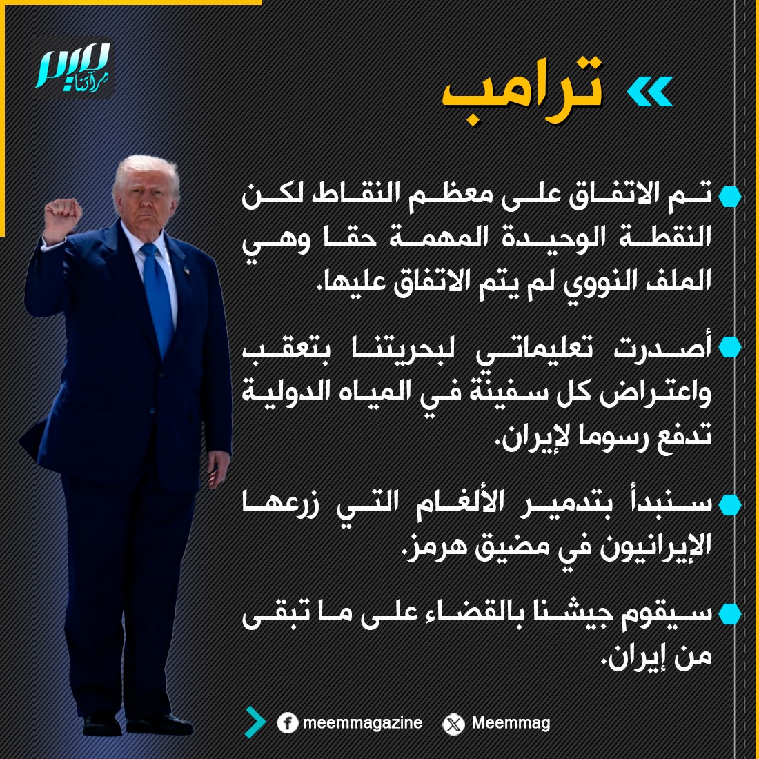 الرئيس الأمريكي دونالد ترامب: سنبدأ بتدمير الألغام التي زرعها الإيرانيون في مضيق هرمز، وسيقوم جيشنا بالقضاء على ما تبقى من إيران.