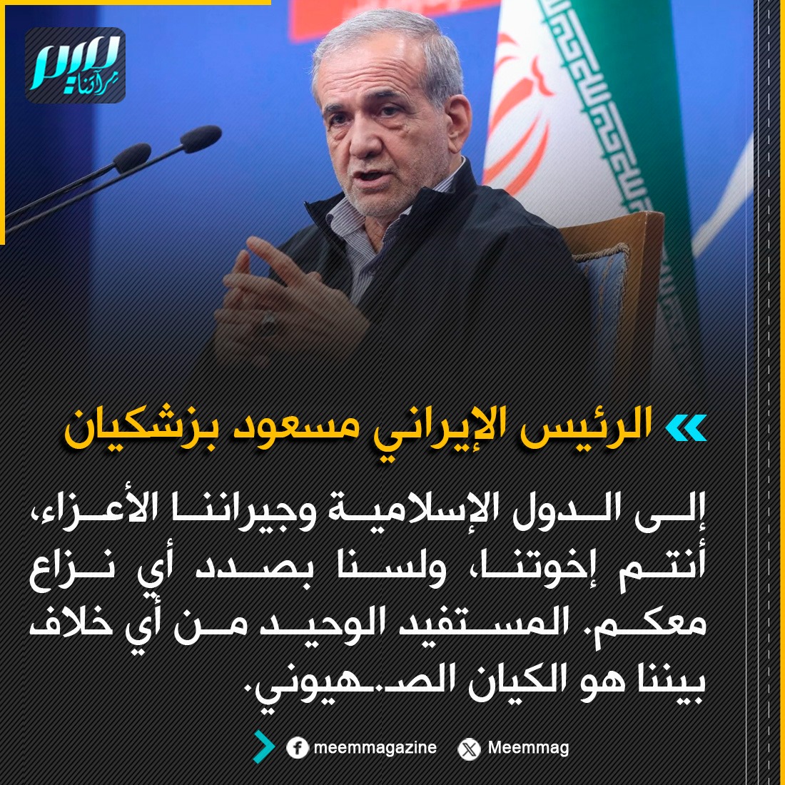 الرئيس الإيراني مسعود بزشكيان: إلى الدول الإسلامية وجيراننا الأعزاء، أنتم إخوتنا، ولسنا بصدد أي نزاع معكم