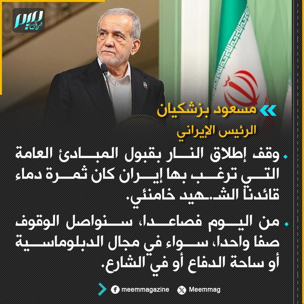الرئيس الإيراني: وقف إطلاق النار بقبول المبادئ العامة التي ترغب بها إيران كان ثمرة دماء قائدنا الشـ.ـهيد خامنئي.