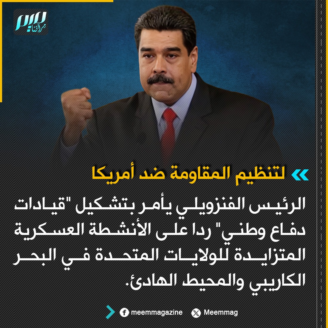 الرئيس الفنزويلي يأمر بتشكيل "قيادات دفاع وطني" ردا على الأنشطة العسكرية المتزايدة للولايات المتحدة في البحر الكاريبي والمحيط الهادئ.