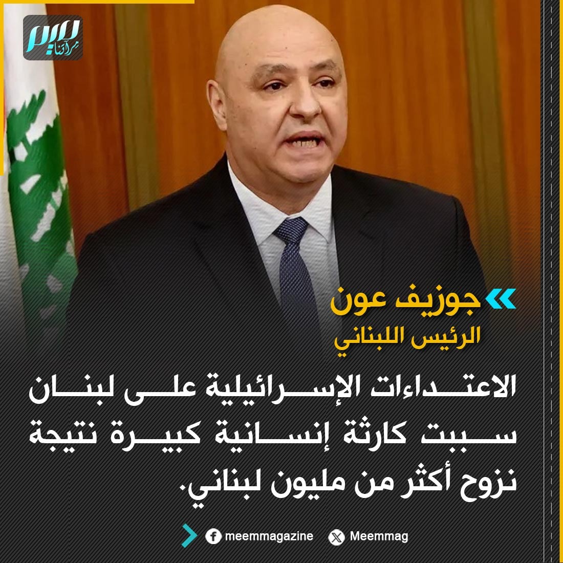 الرئيس اللبناني جوزيف عون: الاعتداءات الإسرائيلية على لبنان سببت كارثة إنسانية كبيرة نتيجة نزوح أكثر من مليون لبناني.