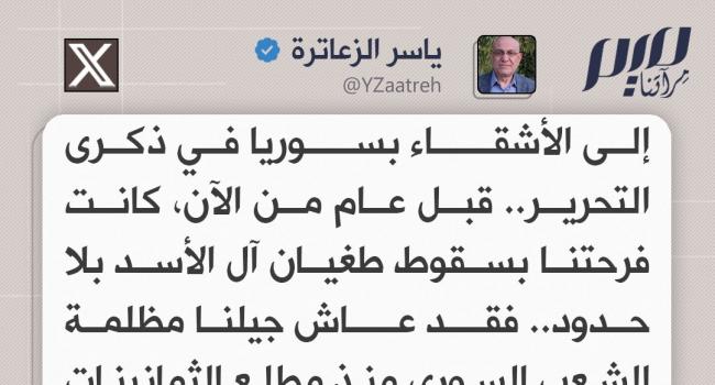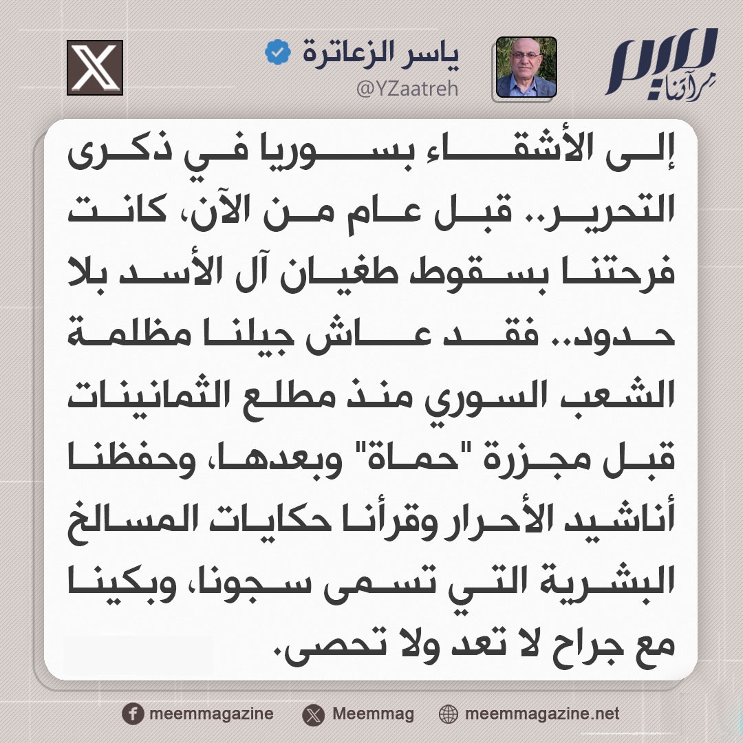 الزعاترة: إلى الأشقاء بسوريا في ذكرى التحرير.. قبل عام من الآن، كانت فرحتنا بسقوط طغيان آل الأسد بلا حدود.. حفظنا أناشيد الأحرار وقرأنا حكايات المسالخ البشرية التي تسمى سجونا، وبكينا مع جراح لا تعد ولا تحصى.