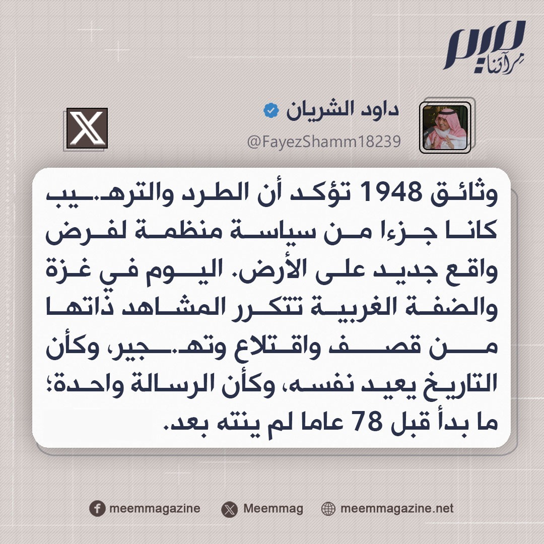 الإعلامي السعودي داوود الشريان: وثائق 1948 تؤكد أن الطرد والترهـ.ـيب كانا جزءا من سياسة منظمة لفرض واقع جديد على الأرض. اليوم في غزة والضفة الغربية تتكرر المشاهد ذاتها من قصــ.ـف واقتلاع وتهـ.ـجير.