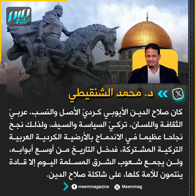 الشنقيطي: كان صلاح الدين الأيوبي كرديّ الأصل والنسب، عربيّ الثقافة واللسان، تركيّ السياسة والسيف، ولذلك نجح نجاحا عظيما في الاندماج بالأرضية الكردية العربية التركية المشتركة، فدخل التاريخ من أوسع أبوابه، ولن يجمع شعوب الشرق المسلمة اليوم إلا قادة ينتمون للأمة كلها، على شاكلة صلاح