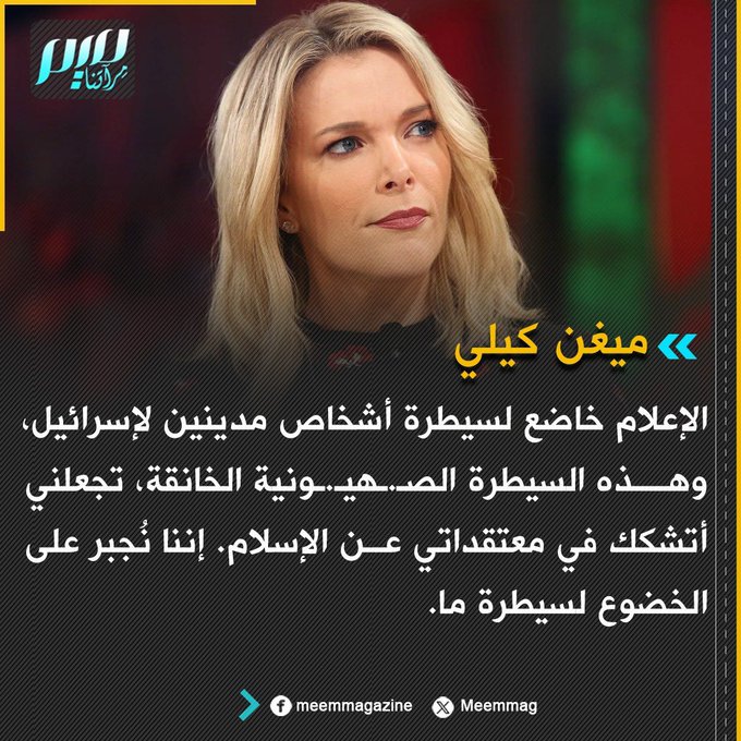 الصحفية الأمريكية ميغن كيلي: الإعلام خاضع لسيطرة أشخاص مدينين لإسرائيل، وهذه السيطرة الصـ.ـهيـ.ـونية الخانقة، تجعلني أتشكك في معتقداتي عن الإسلام.