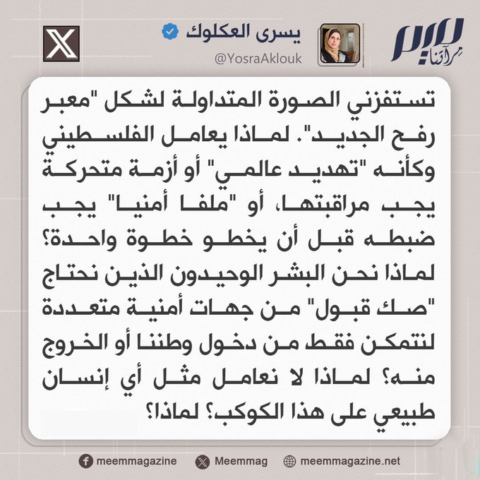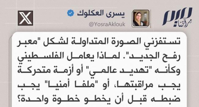 الصحفية الفلسطينية يسرى العكلوك: لماذا يُعامل الفلسطيني وكأنه "تهديد عالمي" أو أزمة متحركة يجب مراقبتها، أو "ملفًا أمنيًا" يجب ضبطه قبل أن يخطو خطوة واحدة؟
