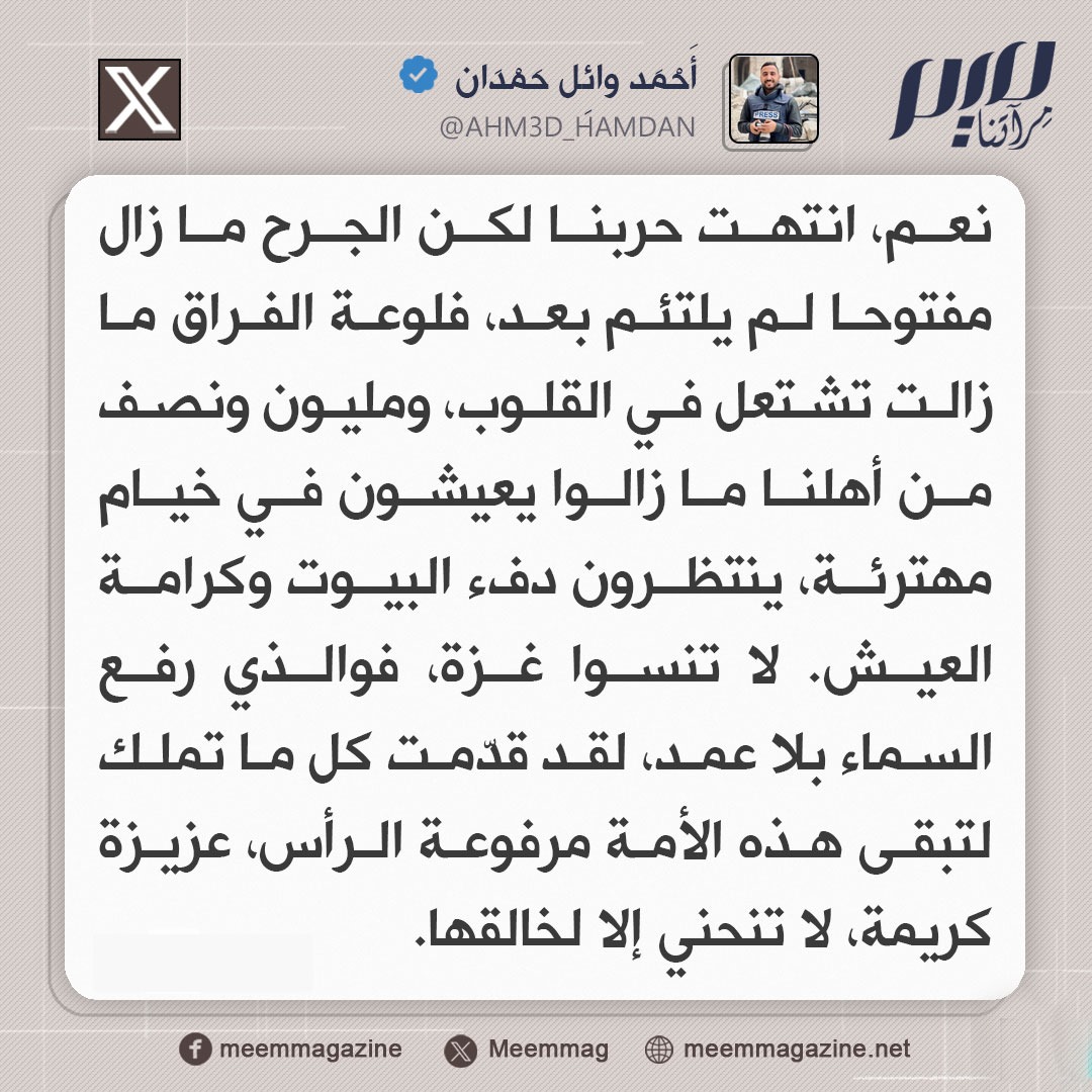 الصحفي الغزي أحمد حمدان: لا تنسوا غزة، فوالذي رفع السماء بلا عمد، لقد قدّمت كل ما تملك لتبقى هذه الأمة مرفوعة الرأس، عزيزة كريمة، لا تنحني إلا لخالقها.