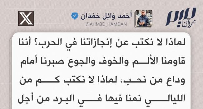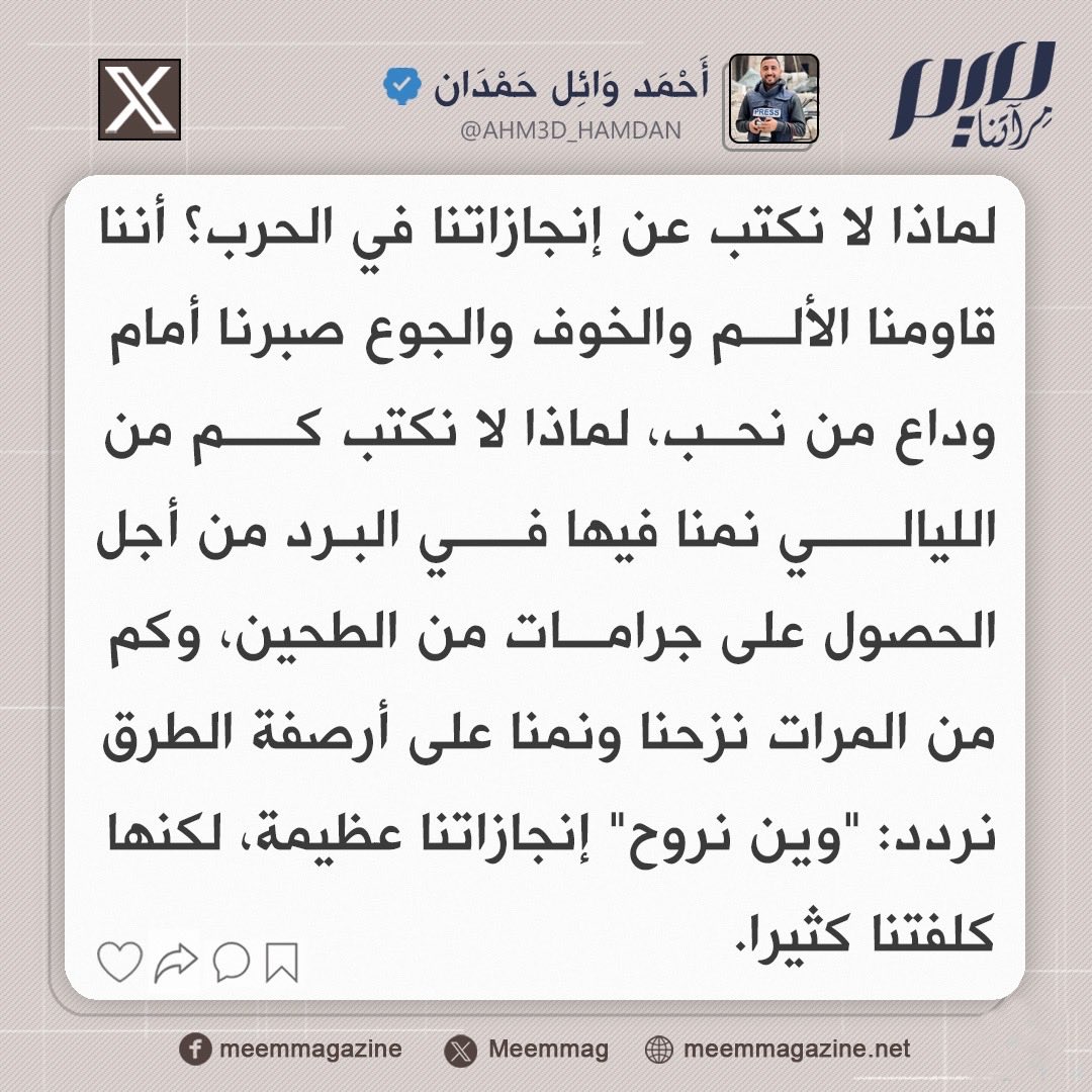 الصحفي الغزي أحمد حمدان: لماذا لا نكتب عن إنجازاتنا في الحرب؟ أننا قاومنا الألم والخوف والجوع صبرنا أمام وداع من نحب، لماذا لا نكتب كم من الليالي نمنا فيها في البرد من أجل الحصول على جرامات من الطحين، وكم من المرات نزحنا ونمنا على أرصفة الطرق نردد: "وين نروح" إنجازاتنا عظيمة، لكنها كلفتنا كثيرا.