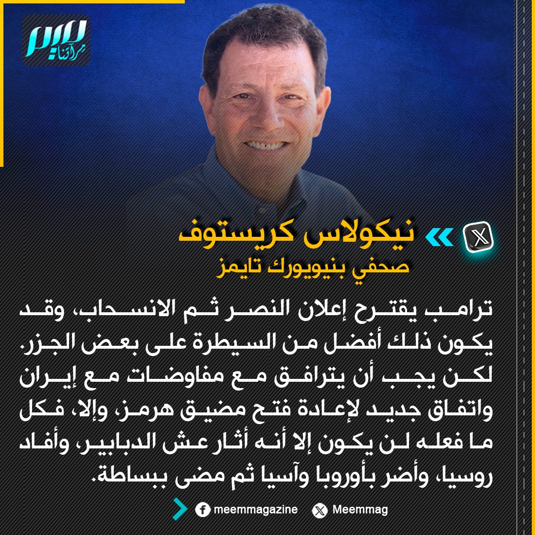 الصحفي نيكولاس كريستوف: ترامب يقترح إعلان النصر ثم الانسحاب، وقد يكون ذلك أفضل من السيطرة على بعض الجزر. لكن يجب أن يترافق مع مفاوضات مع إيران واتفاق جديد لإعادة فتح مضيق هرمز، وإلا، فكل ما فعله لن يكون إلا أنه أثار عش الدبابير، وأفاد روسيا، وأضر بأوروبا وآسيا ثم مضى ببساطة.