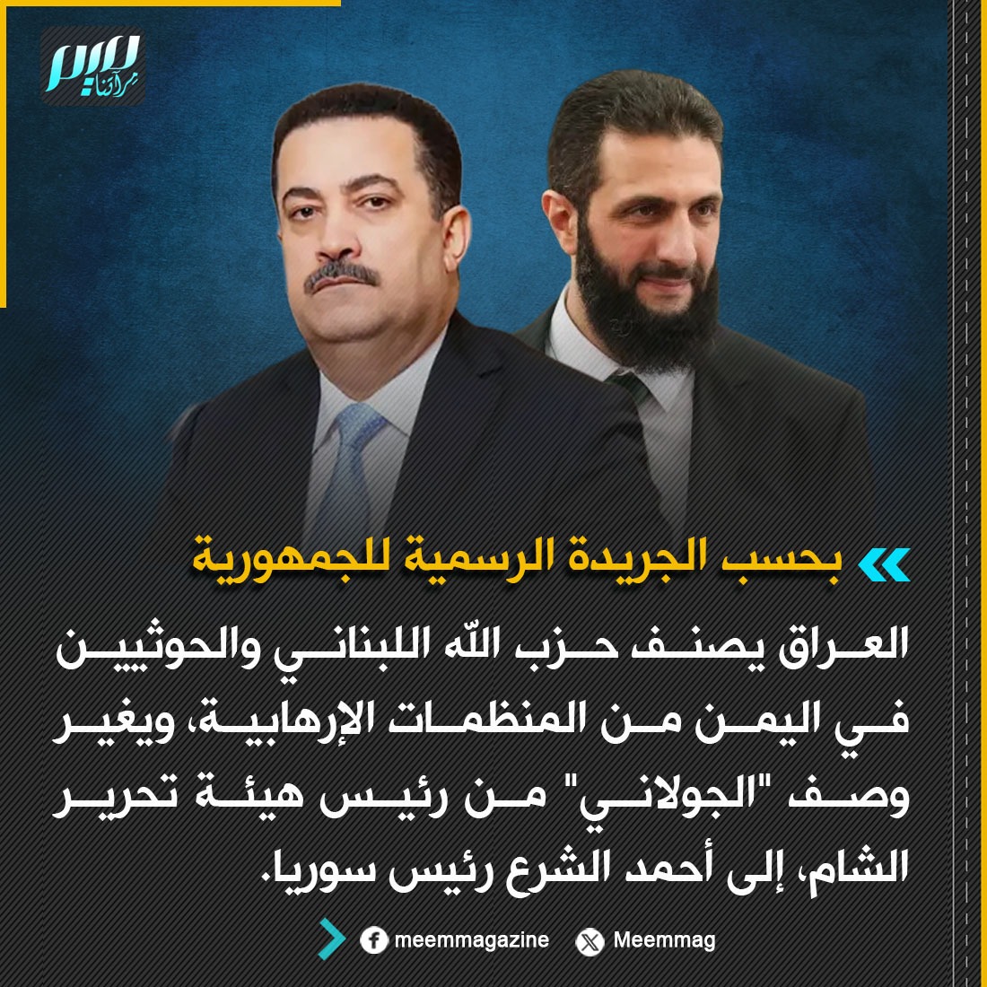 العراق يصنف حزب الله اللبناني والحوثيين في اليمن من المنظمات الإرهابية، ويغير وصف "الجولاني" من رئيس هيئة تحرير الشام، إلى أحمد الشرع رئيس سوريا، بحسب ما جاء في الجريدة الرسمية للجمهورية.