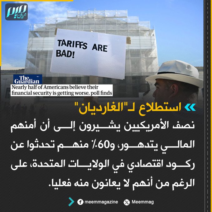 الغارديان: نصف الأمريكيين يشيرون إلى أن أمنهم المالي يتدهور، و60% منهم تحدثوا عن ركود اقتصادي في الولايات المتحدة، على الرغم من أنهم لا يعانون منه فعليا.