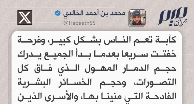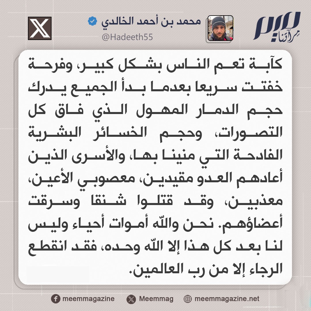 الغزي محمد الخالدي: كآبة تعم الناس بشكل كبير، وفرحة خفتت سريعا بعدما بدأ الجميع يدرك حجم الدمار المهول الذي فاق كل التصوّرات، وحجم الخسائر البشرية الفادحة التي منينا بها.