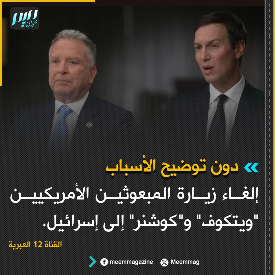 القناة 12 العبرية: إلغاء زيارة المبعوثين الأمريكيين "ويتكوف" و"كوشنر" إلى إسرائيل، دون توضيح الأسباب
