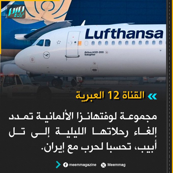 القناة 12 العبرية: مجموعة لوفتهانزا الألمانية تمدد إلغاء رحلاتها الليلية إلى تل أبيب، تحسبا لحرب مع إيران.