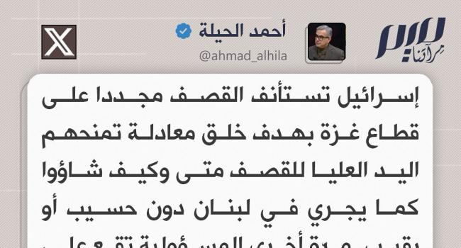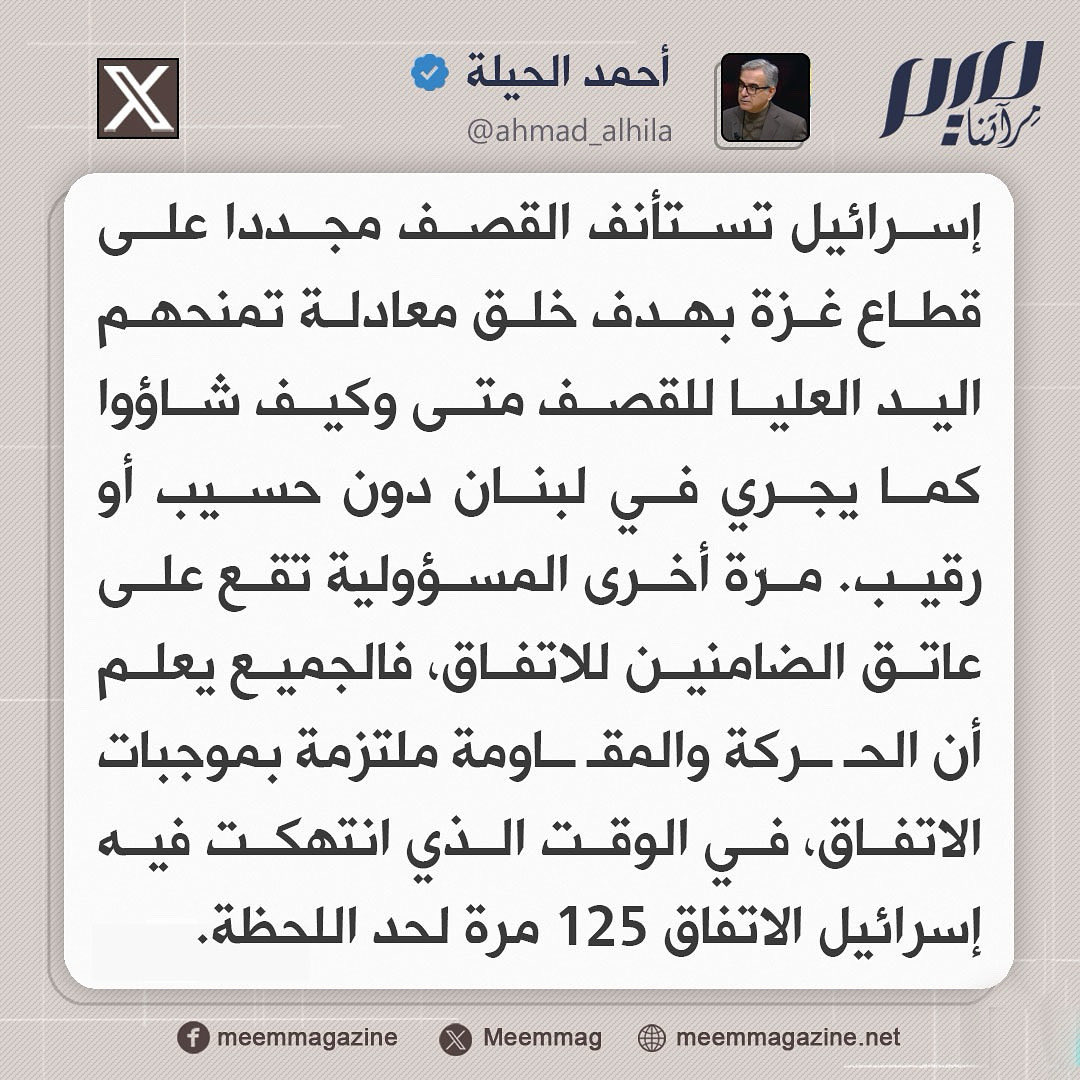 الكاتب أحمد الحيلة: إسرائيل تستأنف القـ ـصف مجددا على قطاع غزة بهدف خلق معادلة تمنحهم اليد العليا للقـ ـصف متى وكيف شاؤوا كما يجري في لبنان دون حسيب أو رقيب.