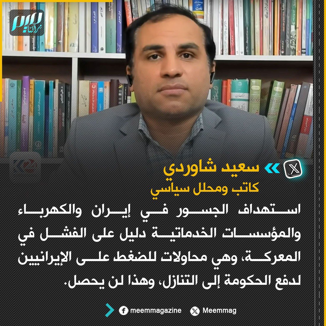 الكاتب والمحلل السياسي سعيد شاوردي: استهداف الجسور في إيران والكهرباء والمؤسسات الخدماتية دليل على الفشل في المعركة، وهي محاولات للضغط على الإيرانيين لدفع الحكومة إلى التنازل، وهذا لن يحصل.