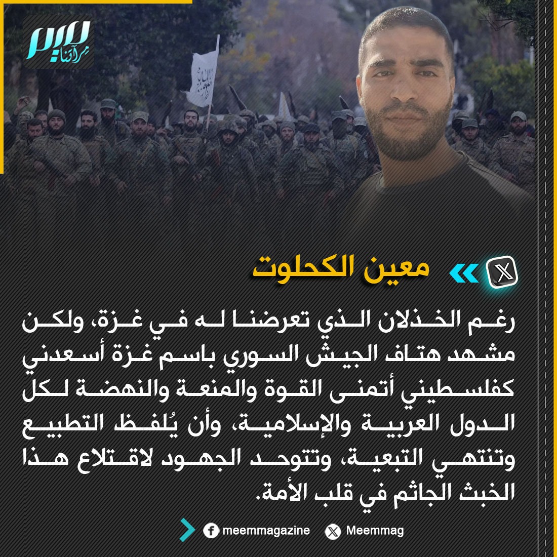 الكحلوت: رغم الخذلان الذي تعرضنا له في غزة، ولكن مشهد هتاف الجيش السوري باسم غزة أسعدني كفلسطيني أتمنى القوة والمنعة والنهضة لكل الدول العربية والإسلامية، وأن يُلفظ التطبيع وتنتهي التبعية، وتتوحد الجهود لاقتلاع هذا الخبث الجاثم في قلب الأمة.