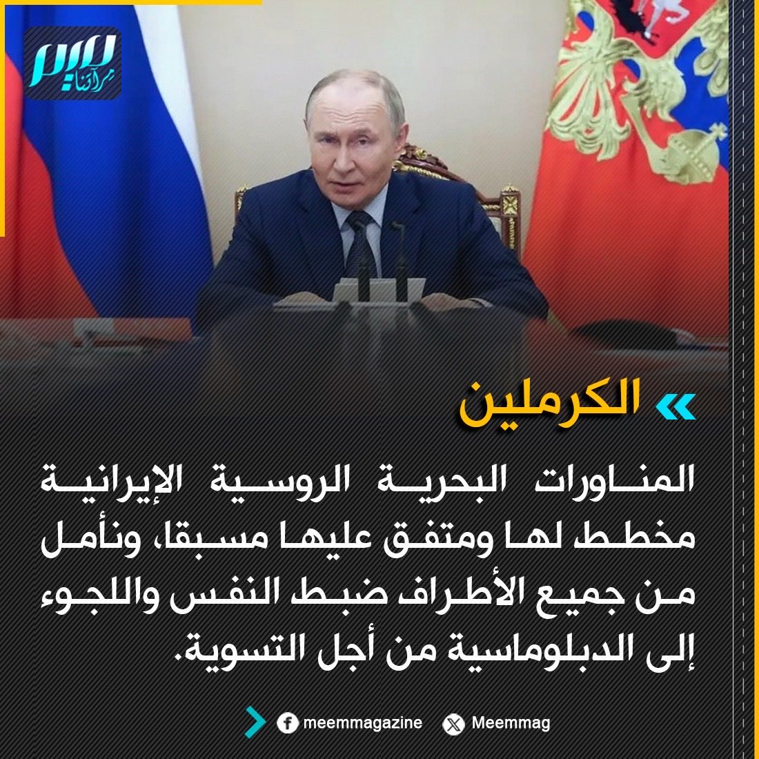 الكرملين: المناورات البحرية الروسية الإيرانية مخطط لها ومتفق عليها مسبقا، ونأمل من جميع الأطراف ضبط النفس واللجوء إلى الدبلوماسية من أجل التسوية.