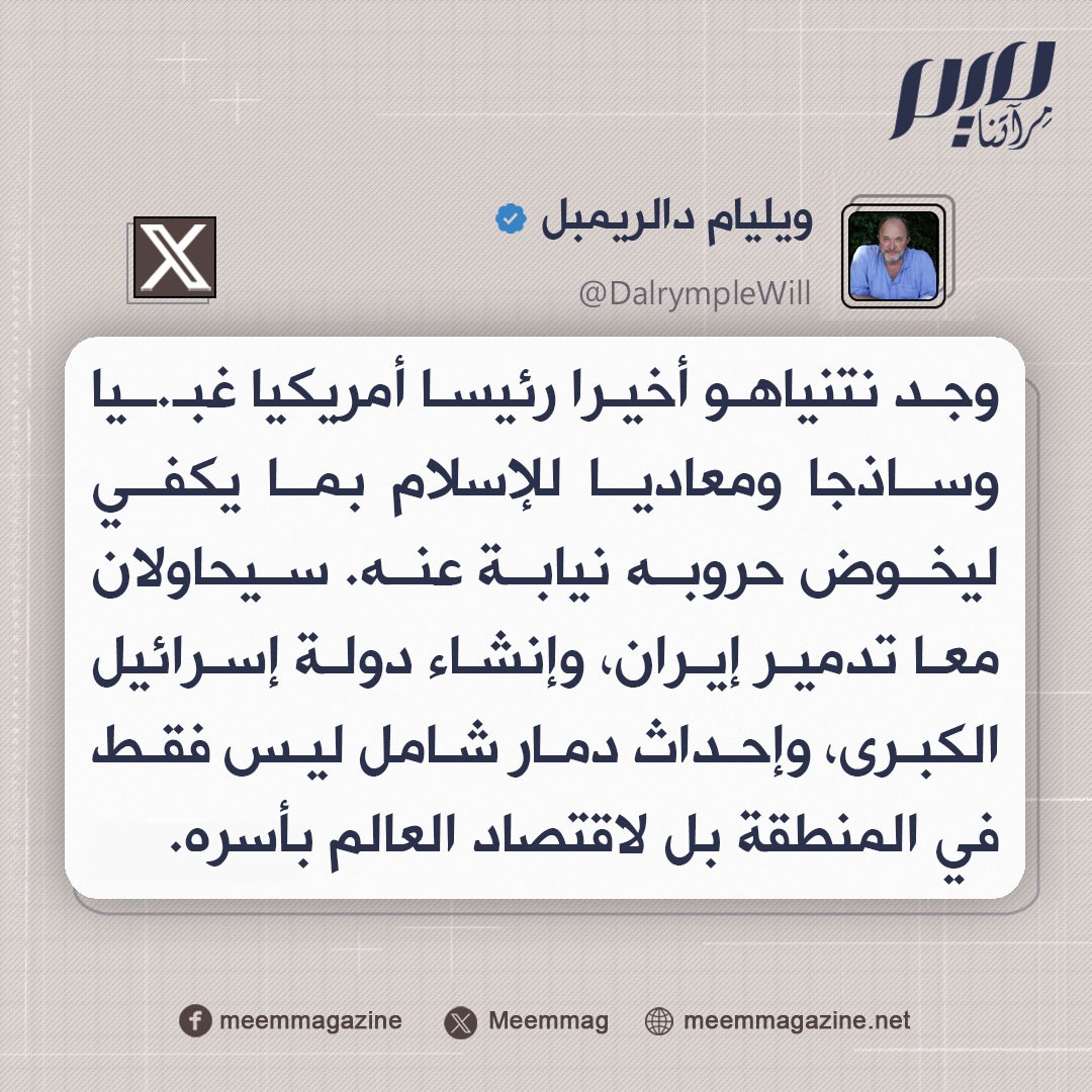 المؤرخ البريطاني ويليام دالريمبل: نتنياهو وجد أخيرا رئيسا أمريكيا غبـ.ـيا وساذجا ومعاديا للإسلام بما يكفي ليخوض حروبه نيابة عنه.