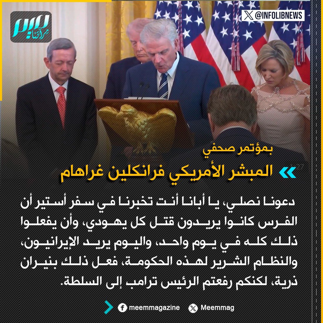 المبشر الأمريكي فرانكلين غراهام: دعونا نصلي، يا أبانا أنت تخبرنا في سفر أستير أن الفرس كانوا يريدون قتل كل يهودي، وأن يفعلوا ذلك كله في يوم واحد، واليوم يريد الإيرانيون، والنظام الشرير لهذه الحكومة، فعل ذلك بنيران ذرية، لكنكم رفعتم الرئيس ترامب إلى السلطة.